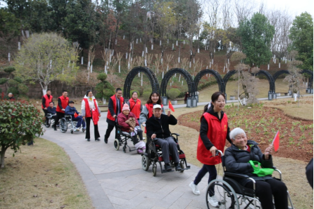 短暫休整后,志愿者們又推著輪椅向山上走,由于坡度較大,志愿者們汗流浹背,依次交替,相互幫助,老人們甚是感動。